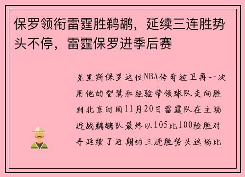 克里斯·保罗,这位NBA传奇控卫,再一次用他的智慧和经验带领球队走向胜利。北京时间11月20日,雷霆队在主场迎战鹈鹕队,最终以105比100险胜对手,延续了近期的三连胜势头。这场比赛不仅展现了保罗的个人实力,也体现了他作为球队核心的领导力。